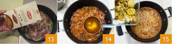 ensuite, versez dans la poêle les grains de farine de légumineuses 13 et faites-les légèrement griller, puis mouillez avec quelques louches de bouillon 14. Ajoutez aussi les châtaignes épluchées 15