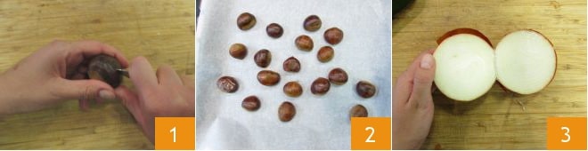 Pour préparer les grains de farine de légumineuses avec châtaignes et lardons, commencez par les châtaignes : incisez d'abord la coque en pratiquant une coupe horizontale avec un couteau bien aiguisé 1, puis disposez les châtaignes sur une plaque recouverte de papier sulfurisé 2 et faites-les cuire dans un four statique préchauffé à 200° pendant environ 20 minutes. Pendant que les châtaignes cuisent, préparez le bouillon : lavez les légumes et coupez l'oignon en deux sans enlever la peau 3,