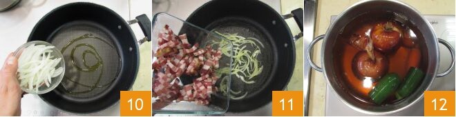 Chauffez un filet d'huile dans une poêle, ajoutez l'oignon 10 et faites-le revenir environ 5 minutes, puis ajoutez les lardons 11 et faites-les dorer pendant environ 4 minutes supplémentaires. Le bouillon de légumes sera maintenant prêt 12,