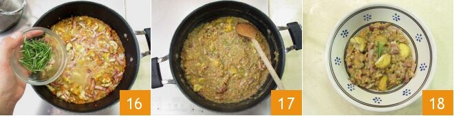 et le romarin 16, rectifiez l'assaisonnement en sel et poivre et faites cuire environ 20 minutes, en ajoutant le bouillon peu à peu comme un risotto. Après le temps de cuisson, vous devrez obtenir une consistance douce et crémeuse 17. Assaisonnez avec un filet d'huile d'olive et un dernier tour de moulin à poivre et vos grains de farine de légumineuses avec châtaignes et lardons sont prêts à être dégustés 18 !
