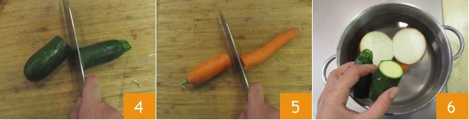 puis coupez également la courgette et la carotte en deux sans les éplucher ni les équeuter (4-5). Versez l'eau dans une casserole, ajoutez les légumes 6, portez à ébullition et laissez mijoter pendant environ 10 minutes.