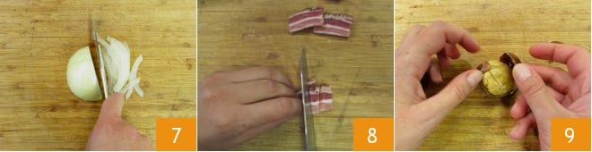 Entre-temps, préparez les autres ingrédients : épluchez et coupez l'oignon en fines tranches 7, puis coupez les lardons en lanières 8 et épluchez les châtaignes qui sont maintenant cuites 9.