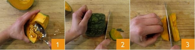 Pour préparer les grains de farine de légumineuses avec saucisse et potiron à la bière, commencez par le potiron : enlevez-en les graines 1 et la peau externe 2. Puis, réduisez la chair en tranches d'environ 1 cm 3