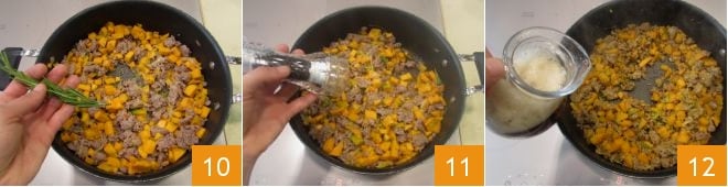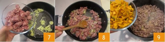 faites revenir le poireau dans une poêle avec un filet d'huile déjà chaud. Remuez souvent pour éviter qu'il n'adhère au fond ou ne brûle. Une fois attendri, ajoutez aussi la saucisse 7, mélangez et ajoutez le potiron 9 et continuez à faire revenir, en remuant, à feu moyen jusqu'à ce que la saucisse commence à dorer.