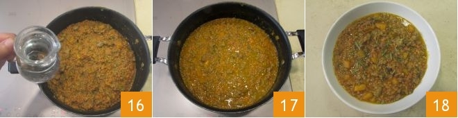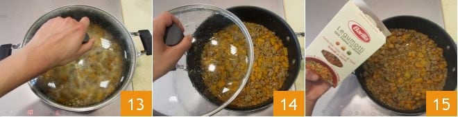 baissez le feu et laissez cuire à couvert pendant environ 10 minutes 13. Une fois que le potiron est assez tendre, retirez le couvercle 14, ajoutez les grains de farine de légumineuses 15,