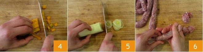 puis en dés 4. Coupez la partie verte du poireau et la racine, puis enlevez les feuilles et coupez-le en rondelles 5. Ensuite, prenez la saucisse et retirez le boyau ; réduisez-la en morceaux grossièrement 6,