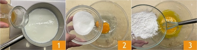 Pour réaliser la grande zeppole au café, commencez par la crème pâtissière. Préparez le café et mettez-le de côté. Faites tremper les feuilles de gélatine dans de l'eau froide, puis versez le lait et le café de la moka dans une casserole 1 et portez à frôler l'ébullition. Entre-temps, fouettez le jaune d'œuf avec le sucre dans un bol 2, puis ajoutez la fécule de maïs 3 et mélangez encore.