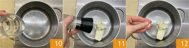 En attendant, préparez la pâte à choux : versez l'eau dans une casserole à double fond 10, puis ajoutez le beurre, une pincée de sel 11 et une pincée de sucre 12. Allumez le feu et portez à ébullition.