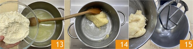 Quand le beurre est fondu, ajoutez la farine d'un seul coup 13 et mélangez rapidement avec une cuillère en bois jusqu'à ce que le mélange se détache complètement des bords et que le fond soit voilé d'un film opaque 14. Transférez la pâte dans un robot équipé de la feuille 15.