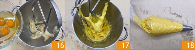 Actionnez le robot à vitesse moyenne et ajoutez les œufs un à un, en veillant à ce que chacun soit bien absorbé avant d'ajouter le suivant 16. Vous devez obtenir un mélange lisse, épais et homogène 17. Transférez la pâte dans une poche à douille avec une douille étoilée de 15 mm 18.