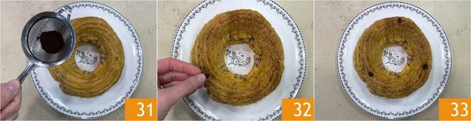 Recouvrez avec la partie supérieure et garnissez de café en poudre tamisé 31 et de grains de café 32. Votre grande zeppole au café est prête à être servie 33 !