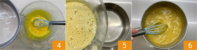 Ajoutez le café au lait chaud au mélange de jaunes d'œufs 4 et mélangez bien avec le fouet, puis versez à nouveau le tout dans la casserole 5 et remettez sur le feu. Remuez continuellement avec le fouet jusqu'à ce que la crème commence à épaissir 6.