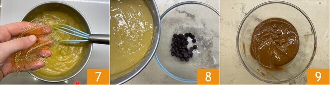 Quand elle a épaissi, éteignez le feu et ajoutez la gélatine, après l'avoir bien essorée 7. Mélangez bien pour l'incorporer, elle doit se dissoudre complètement. Versez la crème dans un bol où vous aurez mis le chocolat en morceaux 8, puis mélangez avec la spatule pour le faire fondre uniformément 9. Couvrez la crème avec un film plastique au contact et laissez refroidir au réfrigérateur.
