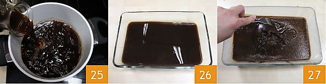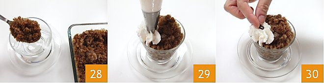 Ajoutez ensuite le café fraîchement préparé 10 et transférez le mélange dans un récipient plat et large 11 pour accélérer la congélation. Laissez-le refroidir, retirez la gousse de vanille et couvrez le récipient avec une couche de film plastique. Placez au congélateur pendant au moins 15-20 minutes. Lorsque le mélange a solidifié, cassez les cristaux de glace avec les dents d'une fourchette ou avec un fouet toutes les 10-15 minutes, en répétant l'opération 2-3 fois 12. Chaque fois, le temps diminuera, car la préparation est déjà froide et prendra donc moins de temps pour solidifier. Cette opération doit être effectuée délicatement pour ne pas altérer la couleur du granité. En effet, s'il incorpore trop d'air, il risque de devenir beige et non plus brun foncé. En attendant, montez la crème fraîche liquide et le sucre glace avec un batteur électrique pour garnir le granité.