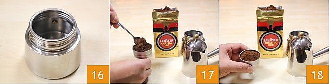 Pour préparer le granité au café, commencez par faire le café. Pour obtenir un excellent café, remplissez la chaudière de votre cafetière avec de l'eau froide et de préférence pauvre en calcaire en veillant bien à ne pas dépasser la soupape de sécurité 1 (sinon vous obtiendrez un café plus long). Remplissez le filtre avec le café moulu en formant une petite montagne que vous nivelerez en tapant le filtre sur la table avec des mouvements décidés 2. Ne pressez pas avec la cuillère, ni ne faites de trous à la surface 3.