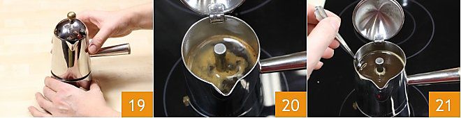Fermez la cafetière très serrée 4, pour que le café ne s'échappe pas par les côtés pendant qu'il monte, et placez-la sur une flamme basse et constante pour obtenir un café corsé. À mesure que le café monte, une mousse dense se formera 5: nous vous conseillons de ne pas laisser bouillir le café trop longtemps pour préserver sa douceur et son arôme. Votre café est prêt: avant de l'utiliser, mélangez-le directement dans la cafetière avec une cuillère pour rendre le café plus homogène 6.