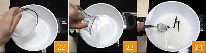 Passons maintenant à la préparation du granité: dans une casserole antiadhésive, versez le sucre 7 et ajoutez l'eau 8. Après avoir coupé en deux une gousse de vanille, videz-la et ajoutez-la à l'eau et au sucre avec ses grains 9 et portez à ébullition.