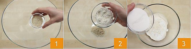 Pour préparer les mini madeleines, commencez par mettre dans un bol la farine d'amande 1. Ajoutez la farine 00 tamisée 2 et le sucre 3.