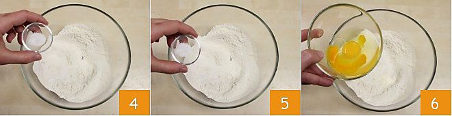 Ajoutez également le sel 4, la levure tamisée 5 et les œufs 6.