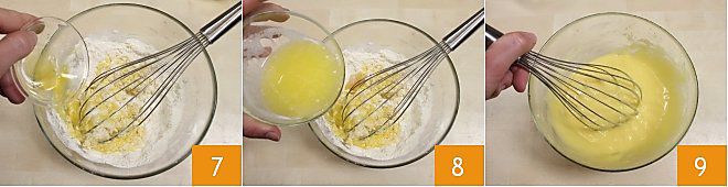 Poursuivez en ajoutant le miel 7 et le beurre fondu au préalable 8, puis mélangez bien avec un fouet manuel 9.