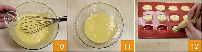 Enfin, ajoutez l'arôme d'amande 10. Couvrez la pâte avec du film plastique et laissez reposer au réfrigérateur au moins deux heures ou, si possible, toute la nuit 11. Versez la préparation dans une poche à douille et prenez un moule à mini madeleines en silicone, avec les formes classiques de coquillage, puis remplissez toutes les formes 12. Si vous n'avez pas de moule en silicone, vous pouvez utiliser un moule en métal et verser la pâte avec une cuillère à café.