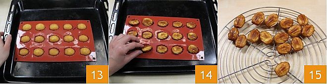 Placez le moule sur une plaque de cuisson et enfournez dans un four statique à 190° pour environ 12 minutes. Si vous utilisez un four ventilé, faites cuire à 170° pendant 6-7 minutes 13; si vous utilisez un moule en métal, faites cuire à 180° jusqu'à ce qu'elles soient dorées. Lorsqu'elles sont tièdes, démoulez-les délicatement 14 et laissez-les refroidir sur une grille 15. Conservez-les sous une cloche en verre ou dans un contenant pour qu'elles gardent leur saveur.