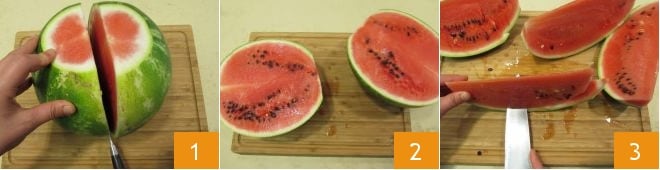 Pour préparer le granité de pastèque, fraises des bois et vodka, commencez par prendre la pastèque : avec un couteau, incisez-la 1 jusqu'à la couper en deux 2, puis coupez-la en tranches 3 et ensuite réduisez-la en petits morceaux.