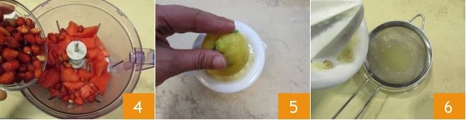 Dans un mixeur, versez la pastèque coupée en morceaux et les fraises des bois 4, puis pressez le citron 5 et filtrez le jus à l'aide d'une passoire 6.