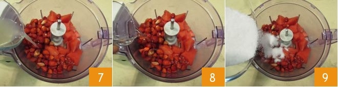 Versez le jus de citron avec la pastèque et le citron 7, puis ajoutez la vodka 8, le sucre 9 et mixez le tout jusqu'à obtenir une consistance plutôt fluide.