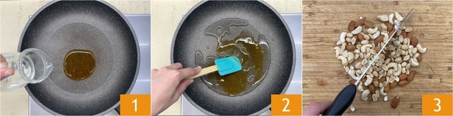 Pour préparer la granola à la poêle, commencez par verser le miel et l’eau dans une poêle antiadhésive 1, allumez le feu et mélangez à feu moyen-doux jusqu'à ce que cela commence à frémir 2. Pendant ce temps, hachez grossièrement les cacahuètes, les amandes et les noix de cajou 3.