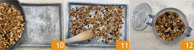 Transférez le mélange sur une plaque en aluminium 10 et étalez-le uniformément pour qu’il refroidisse rapidement 11. Une fois refroidie, la granola est prête à être utilisée ou conservée 12 !