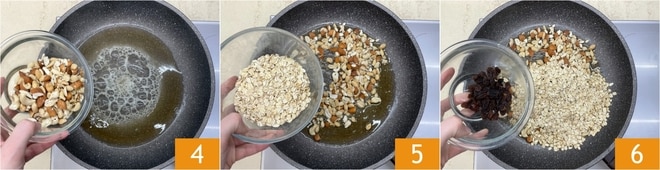 Dès que le sirop commence à faire les premières bulles, augmentez le feu et ajoutez les fruits secs 4, puis ajoutez l’avoine 5 et les raisins secs 6.