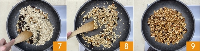 Mélangez continuellement avec une cuillère en bois 7. Quand les ingrédients sont bien amalgamés, baissez le feu et continuez la cuisson à feu moyen-doux pendant environ 20 minutes, en mélangeant toutes les 5 minutes 8. La granola doit être dorée et légèrement grillée 9.