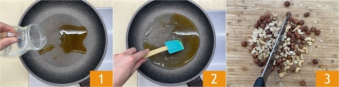 Pour préparer la granola au chocolat, versez le miel et l’eau dans une grande poêle antiadhésive 1, puis allumez le feu et mélangez à feu moyen-doux jusqu’à ce que ça commence à frémir 2. Pendant ce temps, hachez grossièrement les noisettes, les noix de cajou et les cacahuètes 3.