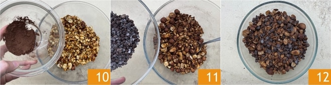 Une fois refroidie, transférez la granola dans un bol, puis ajoutez le cacao 10 et les pépites de chocolat 11. Mélangez bien et utilisez la granola au chocolat comme vous le souhaitez 12 !