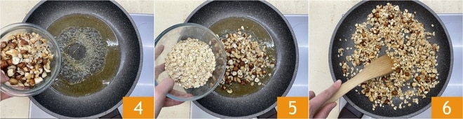 Quand le sirop commence à faire les premières bulles, augmentez le feu et ajoutez les fruits secs 4 et les flocons d’avoine 5. Mélangez avec une cuillère en bois jusqu’à bien amalgamer tous les ingrédients, puis baissez le feu et continuez à cuire pendant environ 20 minutes à feu moyen-doux, en remuant toutes les 5 minutes environ 6.