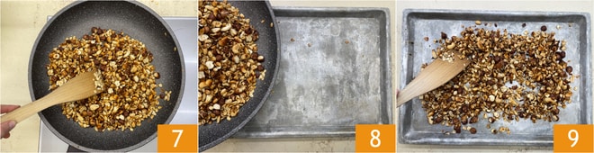 Quand la granola est dorée et légèrement grillée 7, éteignez le feu et versez-la dans un moule en aluminium 8. Répartissez uniformément le mélange 9 et laissez refroidir complètement.