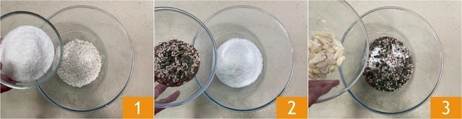 Pour préparer la granola sans sucre, commencez par verser les flocons d'avoine et la noix de coco râpée dans un bol 1. Ajoutez les graines mélangées 2 et les amandes effilées 3.