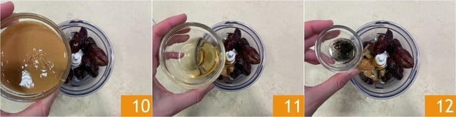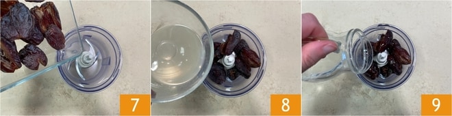 Transférez les dattes dans un mixeur 7, ajoutez l'huile de coco 8 et l'eau 9.