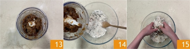 Mixez le tout jusqu'à obtenir une crème grossière 13; ajoutez-la dans le bol avec le mélange de flocons d'avoine et coco 14 et pétrissez à la main 15.