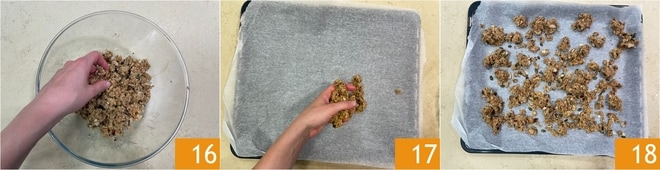 Vous devez obtenir un mélange homogène 16 et l'émietter sur une plaque recouverte de papier sulfurisé 17. Ne vous inquiétez pas si certains morceaux sont plus gros que d'autres 18.