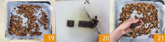 Faites cuire dans un four statique préchauffé à 170° pendant 20-25 minutes en tournant à mi-cuisson. Ensuite, sortez du four et laissez refroidir. Entre-temps, hachez grossièrement le chocolat noir 20, puis ajoutez-le à la granola 21.