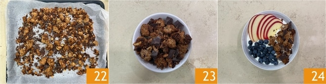 La granola sans sucre est prête 22; vous pouvez la déguster dans du lait, seule 23 ou pour enrichir le yaourt 24.