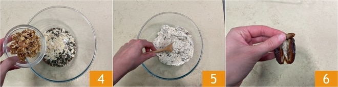 Ajoutez les noix 4, une pincée de sel et mélangez bien 5. Prenez les dattes, ouvrez-les en deux et retirez le noyau 6.