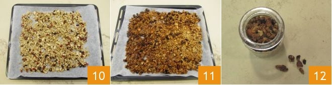 Versez le mélange obtenu sur une plaque recouverte de papier sulfurisé. Répartissez uniformément avec la spatule 10, puis faites cuire dans un four préchauffé statique à 160° pendant 30 minutes sur la grille centrale du four. Une fois la cuisson terminée, démoulez votre granola, qui doit être bien doré, et laissez-le refroidir pendant au moins 30 minutes à température ambiante 11. Après ce temps, la granola maison sera prête : conservez-la dans un bocal en verre jusqu'au moment de la consommer 12.