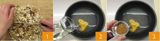 Pour réaliser la granola maison, commencez par rincer les raisins secs et les baies de goji. Ensuite, hachez grossièrement les noisettes, les amandes et les noix 1. Continuez avec le sirop : dans une poêle, versez le miel, l'eau, l'huile 2 et le sucre 3.