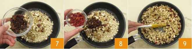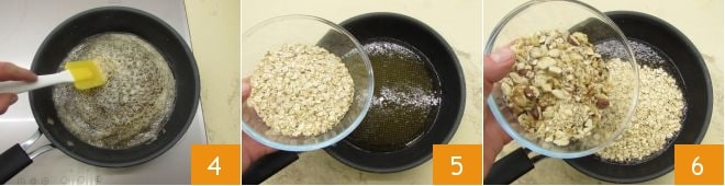 Faites cuire pendant 10 minutes à feu moyen pour créer un sirop 4, puis éteignez le feu et ajoutez les flocons d'avoine 5 et les fruits secs hachés 6
