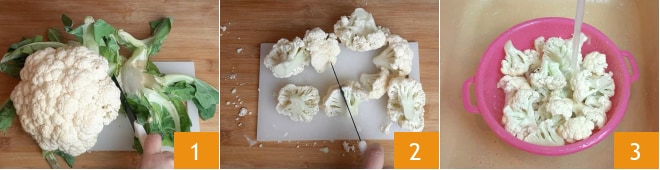 Pour réaliser le gratin de chou-fleur et radicchio, nettoyez le chou-fleur en éliminant les feuilles vertes 1 et le trognon central, et toujours avec l'aide d'un couteau à lame lisse, détachez toutes les fleurettes, en divisant en deux celles qui sont plus grosses 2. Transférez les fleurettes nettoyées dans une passoire et rincez-les sous l'eau froide 3.