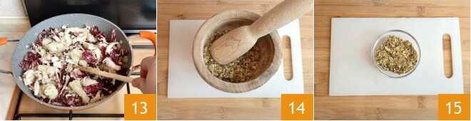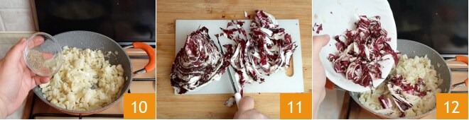 et du poivre 10, mélangez et laissez le tout s'imprégner pendant 5-6 minutes. Pendant ce temps, nettoyez le radicchio en éliminant le trognon central, émincez-le finement 11 et ajoutez-le dans la poêle avec le chou-fleur 12, mélangez, faites sauter quelques secondes pour ne pas le laisser trop flétrir