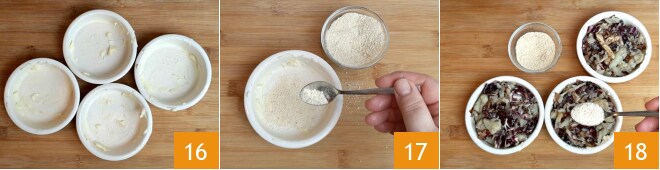 Préchauffez le four à 200°C en mode statique. Beurrez 4 cocottes d'un diamètre d'environ 11 cm 16 puis saupoudrez l'intérieur de chapelure 17. Remplissez chaque cocotte avec le chou-fleur et le radicchio, ajoutez en surface une pincée de chapelure 18